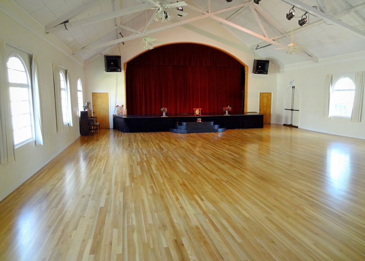 Measures 38 ft. wide by 55 ft. long. Elevated stage measures approx. 22 ft. wide by 15 ft. deep. Separate stage entrance, full curtains, back and side stage area.